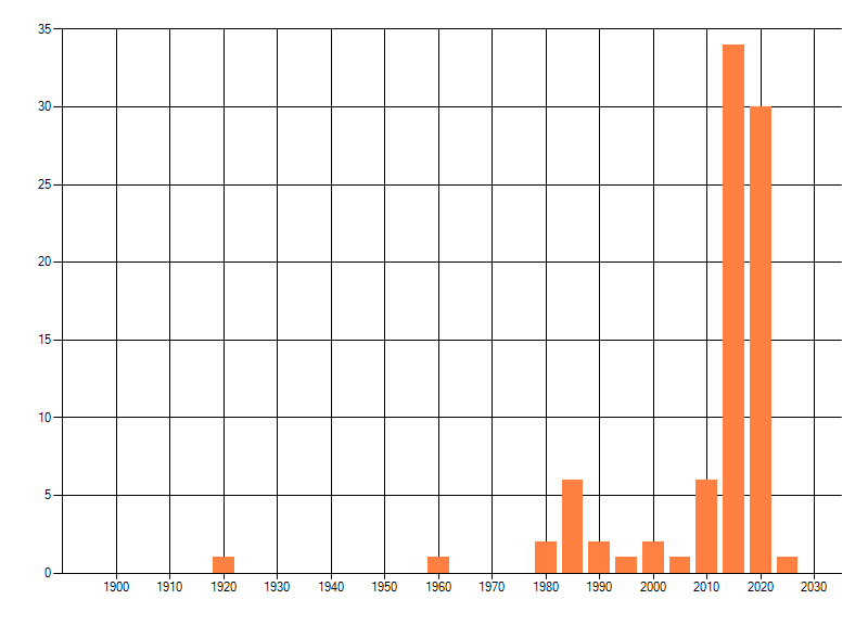 Het aantal atlasblokken (5x5 km) waarin de soort is gemeld binnen een periode van vijf jaar (vanaf 1980) of twintig jaar. Niet gecorrigeerd voor waarnemersinspanning en het aantal doorgegeven waarnemingen kan sterk variëren per periode, dus een trend in verspreiding kan hier niet direct uit worden afgelezen. Het opgegeven jaartal is het eerste jaar van de periode. Bron: gevalideerde waarnemingen uit de NDFF.