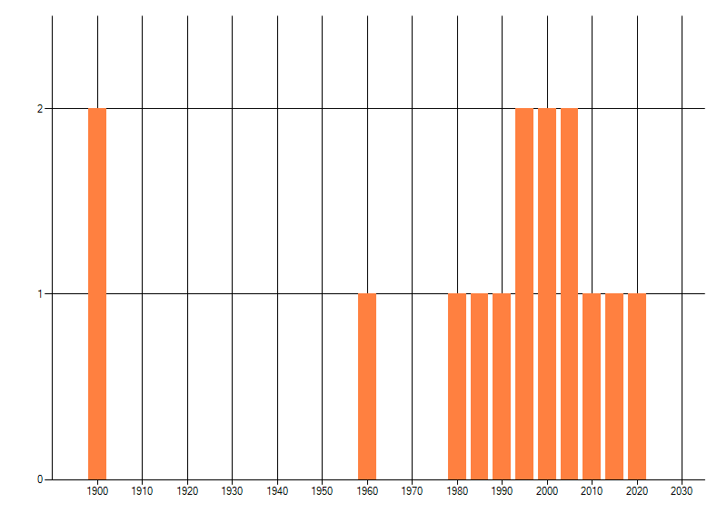 Het aantal atlasblokken (5x5 km) waarin de soort is gemeld binnen een periode van vijf jaar (vanaf 1980) of twintig jaar. Niet gecorrigeerd voor waarnemersinspanning en het aantal doorgegeven waarnemingen kan sterk variëren per periode, dus een trend in verspreiding kan hier niet direct uit worden afgelezen. Het opgegeven jaartal is het eerste jaar van de periode. Bron: gevalideerde waarnemingen uit de NDFF.
