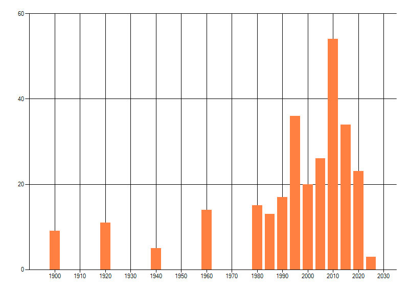 Het aantal atlasblokken (5x5 km) waarin de soort is gemeld binnen een periode van vijf jaar (vanaf 1980) of twintig jaar. Niet gecorrigeerd voor waarnemersinspanning en het aantal doorgegeven waarnemingen kan sterk variëren per periode, dus een trend in verspreiding kan hier niet direct uit worden afgelezen. Het opgegeven jaartal is het eerste jaar van de periode. Bron: gevalideerde waarnemingen uit de NDFF.