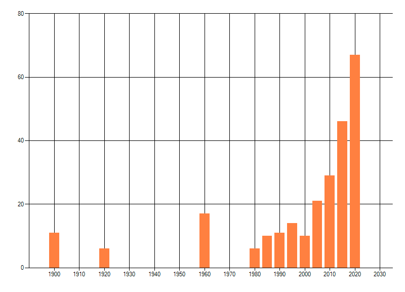 Het aantal atlasblokken (5x5 km) waarin de soort is gemeld binnen een periode van vijf jaar (vanaf 1980) of twintig jaar. Niet gecorrigeerd voor waarnemersinspanning en het aantal doorgegeven waarnemingen kan sterk variëren per periode, dus een trend in verspreiding kan hier niet direct uit worden afgelezen. Het opgegeven jaartal is het eerste jaar van de periode. Bron: gevalideerde waarnemingen uit de NDFF.