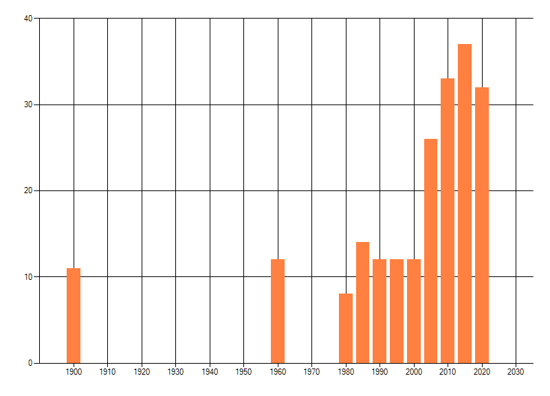 Het aantal atlasblokken (5x5 km) waarin de soort is gemeld binnen een periode van vijf jaar (vanaf 1980) of twintig jaar. Niet gecorrigeerd voor waarnemersinspanning en het aantal doorgegeven waarnemingen kan sterk variëren per periode, dus een trend in verspreiding kan hier niet direct uit worden afgelezen. Het opgegeven jaartal is het eerste jaar van de periode. Bron: gevalideerde waarnemingen uit de NDFF.