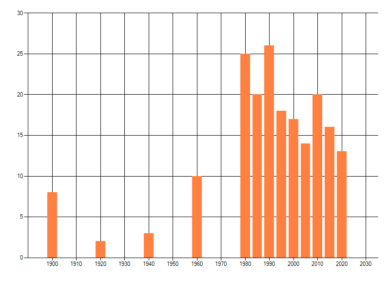 Het aantal atlasblokken (5x5 km) waarin de soort is gemeld binnen een periode van vijf jaar (vanaf 1980) of twintig jaar. Niet gecorrigeerd voor waarnemersinspanning en het aantal doorgegeven waarnemingen kan sterk variëren per periode, dus een trend in verspreiding kan hier niet direct uit worden afgelezen. Het opgegeven jaartal is het eerste jaar van de periode. Bron: gevalideerde waarnemingen uit de NDFF.