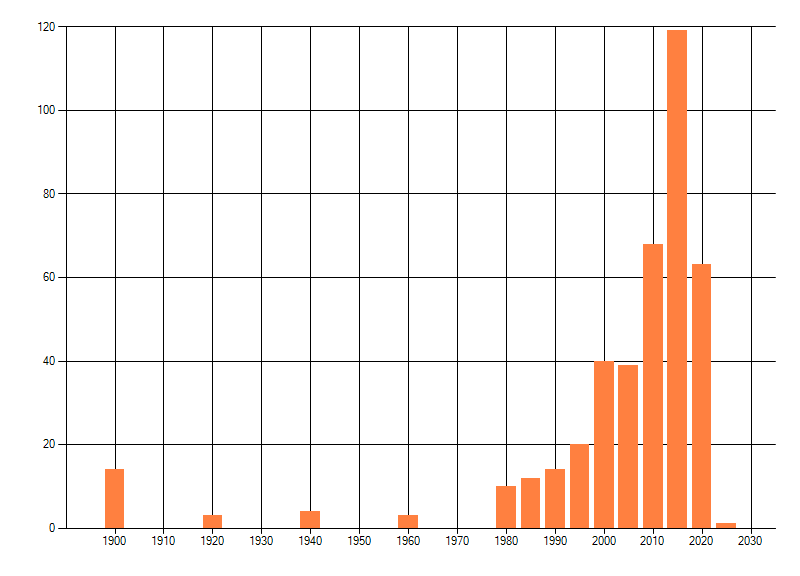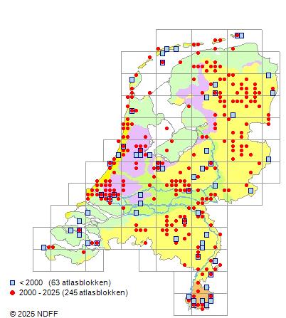 Het aantal atlasblokken (5x5 km) waarin de soort is gemeld binnen een periode van vijf jaar (vanaf 1980) of twintig jaar. Niet gecorrigeerd voor waarnemersinspanning en het aantal doorgegeven waarnemingen kan sterk variëren per periode, dus een trend in verspreiding kan hier niet direct uit worden afgelezen. Het opgegeven jaartal is het eerste jaar van de periode. Bron: gevalideerde waarnemingen uit de NDFF.