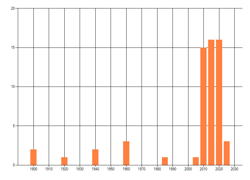 Het aantal atlasblokken (5x5 km) waarin de soort is gemeld binnen een periode van vijf jaar (vanaf 1980) of twintig jaar. Niet gecorrigeerd voor waarnemersinspanning en het aantal doorgegeven waarnemingen kan sterk variëren per periode, dus een trend in verspreiding kan hier niet direct uit worden afgelezen. Het opgegeven jaartal is het eerste jaar van de periode. Bron: gevalideerde waarnemingen uit de NDFF.