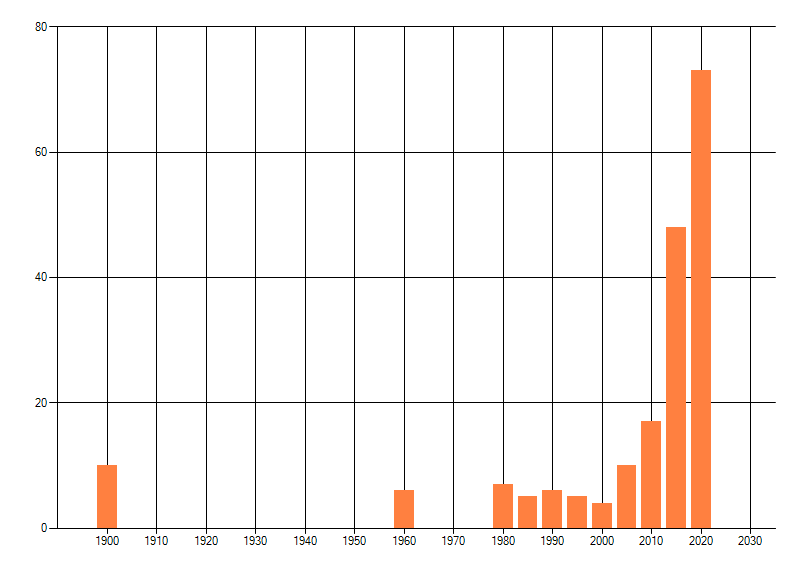 Het aantal atlasblokken (5x5 km) waarin de soort is gemeld binnen een periode van vijf jaar (vanaf 1980) of twintig jaar. Niet gecorrigeerd voor waarnemersinspanning en het aantal doorgegeven waarnemingen kan sterk variëren per periode, dus een trend in verspreiding kan hier niet direct uit worden afgelezen. Het opgegeven jaartal is het eerste jaar van de periode. Bron: gevalideerde waarnemingen uit de NDFF.