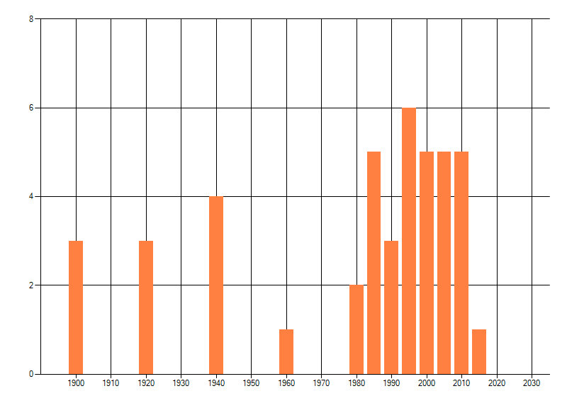 Het aantal atlasblokken (5x5 km) waarin de soort is gemeld binnen een periode van vijf jaar (vanaf 1980) of twintig jaar. Niet gecorrigeerd voor waarnemersinspanning en het aantal doorgegeven waarnemingen kan sterk variëren per periode, dus een trend in verspreiding kan hier niet direct uit worden afgelezen. Het opgegeven jaartal is het eerste jaar van de periode. Bron: gevalideerde waarnemingen uit de NDFF.