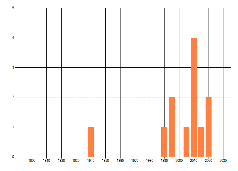 Het aantal atlasblokken (5x5 km) waarin de soort is gemeld binnen een periode van vijf jaar (vanaf 1980) of twintig jaar. Niet gecorrigeerd voor waarnemersinspanning en het aantal doorgegeven waarnemingen kan sterk variëren per periode, dus een trend in verspreiding kan hier niet direct uit worden afgelezen. Het opgegeven jaartal is het eerste jaar van de periode. Bron: gevalideerde waarnemingen uit de NDFF.