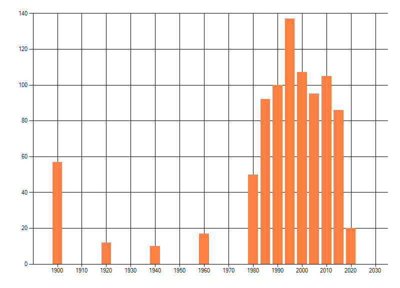 Het aantal atlasblokken (5x5 km) waarin de soort is gemeld binnen een periode van vijf jaar (vanaf 1980) of twintig jaar. Niet gecorrigeerd voor waarnemersinspanning en het aantal doorgegeven waarnemingen kan sterk variëren per periode, dus een trend in verspreiding kan hier niet direct uit worden afgelezen. Het opgegeven jaartal is het eerste jaar van de periode. Bron: gevalideerde waarnemingen uit de NDFF.