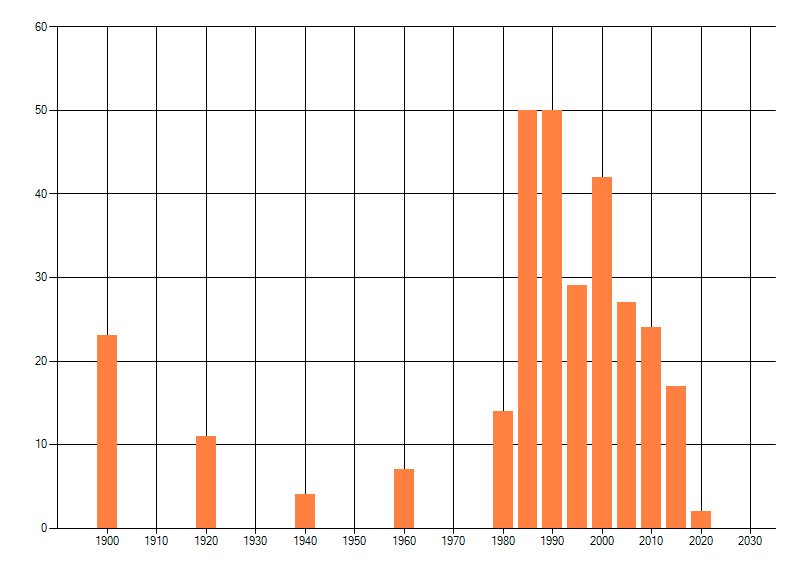 Het aantal atlasblokken (5x5 km) waarin de soort is gemeld binnen een periode van vijf jaar (vanaf 1980) of twintig jaar. Niet gecorrigeerd voor waarnemersinspanning en het aantal doorgegeven waarnemingen kan sterk variëren per periode, dus een trend in verspreiding kan hier niet direct uit worden afgelezen. Het opgegeven jaartal is het eerste jaar van de periode. Bron: gevalideerde waarnemingen uit de NDFF.