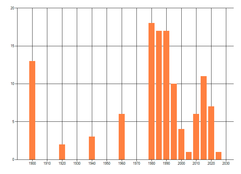 Het aantal atlasblokken (5x5 km) waarin de soort is gemeld binnen een periode van vijf jaar (vanaf 1980) of twintig jaar. Niet gecorrigeerd voor waarnemersinspanning en het aantal doorgegeven waarnemingen kan sterk variëren per periode, dus een trend in verspreiding kan hier niet direct uit worden afgelezen. Het opgegeven jaartal is het eerste jaar van de periode. Bron: gevalideerde waarnemingen uit de NDFF.