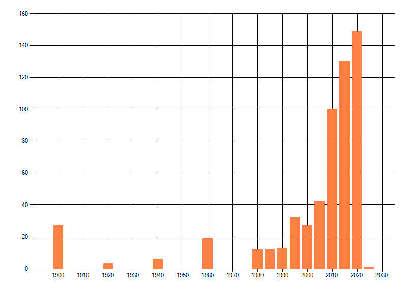 Het aantal atlasblokken (5x5 km) waarin de soort is gemeld binnen een periode van vijf jaar (vanaf 1980) of twintig jaar. Niet gecorrigeerd voor waarnemersinspanning en het aantal doorgegeven waarnemingen kan sterk variëren per periode, dus een trend in verspreiding kan hier niet direct uit worden afgelezen. Het opgegeven jaartal is het eerste jaar van de periode. Bron: gevalideerde waarnemingen uit de NDFF.