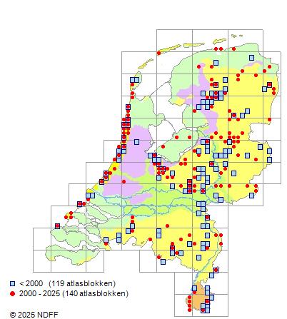 Het aantal atlasblokken (5x5 km) waarin de soort is gemeld binnen een periode van vijf jaar (vanaf 1980) of twintig jaar. Niet gecorrigeerd voor waarnemersinspanning en het aantal doorgegeven waarnemingen kan sterk variëren per periode, dus een trend in verspreiding kan hier niet direct uit worden afgelezen. Het opgegeven jaartal is het eerste jaar van de periode. Bron: gevalideerde waarnemingen uit de NDFF.