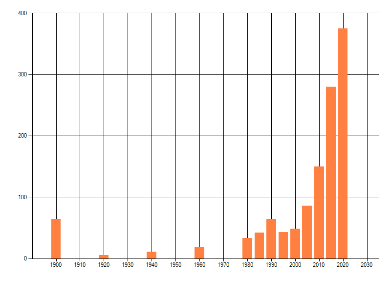 Het aantal atlasblokken (5x5 km) waarin de soort is gemeld binnen een periode van vijf jaar (vanaf 1980) of twintig jaar. Niet gecorrigeerd voor waarnemersinspanning en het aantal doorgegeven waarnemingen kan sterk variëren per periode, dus een trend in verspreiding kan hier niet direct uit worden afgelezen. Het opgegeven jaartal is het eerste jaar van de periode. Bron: gevalideerde waarnemingen uit de NDFF.