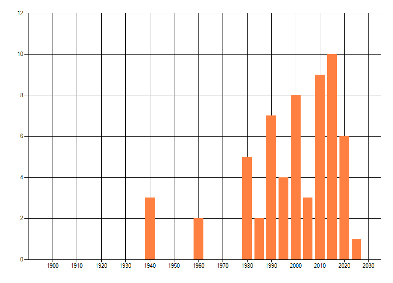Het aantal atlasblokken (5x5 km) waarin de soort is gemeld binnen een periode van vijf jaar (vanaf 1980) of twintig jaar. Niet gecorrigeerd voor waarnemersinspanning en het aantal doorgegeven waarnemingen kan sterk variëren per periode, dus een trend in verspreiding kan hier niet direct uit worden afgelezen. Het opgegeven jaartal is het eerste jaar van de periode. Bron: gevalideerde waarnemingen uit de NDFF.