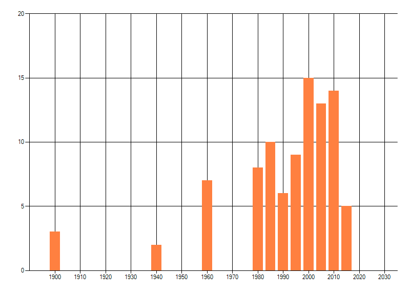 Het aantal atlasblokken (5x5 km) waarin de soort is gemeld binnen een periode van vijf jaar (vanaf 1980) of twintig jaar. Niet gecorrigeerd voor waarnemersinspanning en het aantal doorgegeven waarnemingen kan sterk variëren per periode, dus een trend in verspreiding kan hier niet direct uit worden afgelezen. Het opgegeven jaartal is het eerste jaar van de periode. Bron: gevalideerde waarnemingen uit de NDFF.
