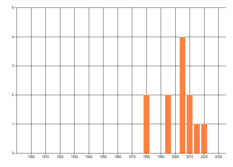 Het aantal atlasblokken (5x5 km) waarin de soort is gemeld binnen een periode van vijf jaar (vanaf 1980) of twintig jaar. Niet gecorrigeerd voor waarnemersinspanning en het aantal doorgegeven waarnemingen kan sterk variëren per periode, dus een trend in verspreiding kan hier niet direct uit worden afgelezen. Het opgegeven jaartal is het eerste jaar van de periode. Bron: gevalideerde waarnemingen uit de NDFF.