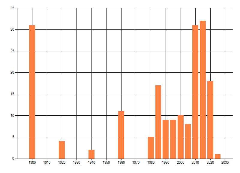 Het aantal atlasblokken (5x5 km) waarin de soort is gemeld binnen een periode van vijf jaar (vanaf 1980) of twintig jaar. Niet gecorrigeerd voor waarnemersinspanning en het aantal doorgegeven waarnemingen kan sterk variëren per periode, dus een trend in verspreiding kan hier niet direct uit worden afgelezen. Het opgegeven jaartal is het eerste jaar van de periode. Bron: gevalideerde waarnemingen uit de NDFF.