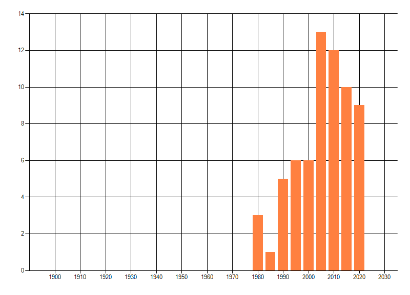 Het aantal atlasblokken (5x5 km) waarin de soort is gemeld binnen een periode van vijf jaar (vanaf 1980) of twintig jaar. Niet gecorrigeerd voor waarnemersinspanning en het aantal doorgegeven waarnemingen kan sterk variëren per periode, dus een trend in verspreiding kan hier niet direct uit worden afgelezen. Het opgegeven jaartal is het eerste jaar van de periode. Bron: gevalideerde waarnemingen uit de NDFF.