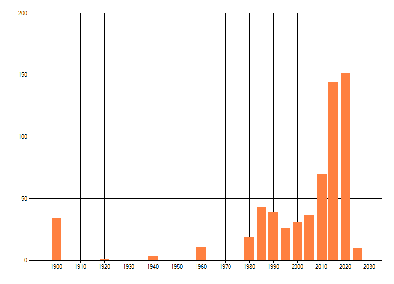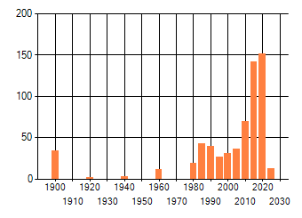Het aantal atlasblokken (5x5 km) waarin de soort is gemeld binnen een periode van vijf jaar (vanaf 1980) of twintig jaar. Niet gecorrigeerd voor waarnemersinspanning en het aantal doorgegeven waarnemingen kan sterk variëren per periode, dus een trend in verspreiding kan hier niet direct uit worden afgelezen. Het opgegeven jaartal is het eerste jaar van de periode. Bron: gevalideerde waarnemingen uit de NDFF.