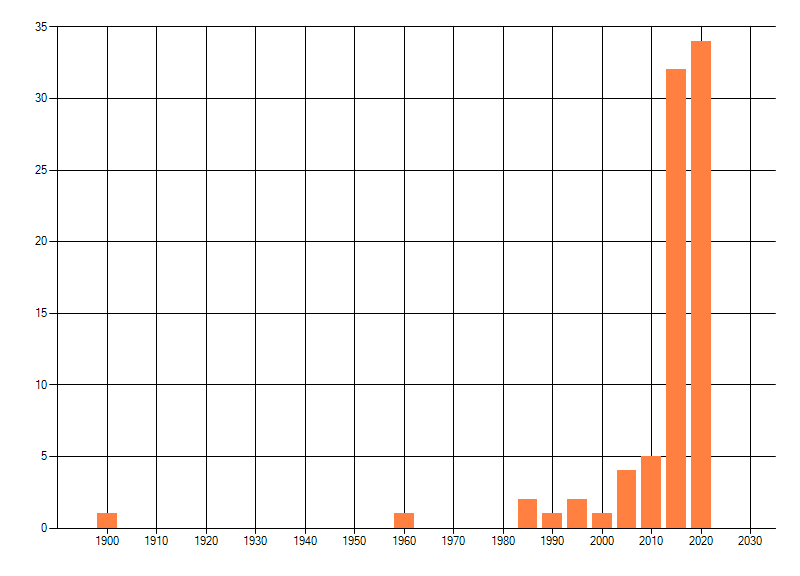 Het aantal atlasblokken (5x5 km) waarin de soort is gemeld binnen een periode van vijf jaar (vanaf 1980) of twintig jaar. Niet gecorrigeerd voor waarnemersinspanning en het aantal doorgegeven waarnemingen kan sterk variëren per periode, dus een trend in verspreiding kan hier niet direct uit worden afgelezen. Het opgegeven jaartal is het eerste jaar van de periode. Bron: gevalideerde waarnemingen uit de NDFF.