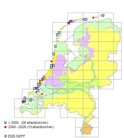 Het aantal atlasblokken (5x5 km) waarin de soort is gemeld binnen een periode van vijf jaar (vanaf 1980) of twintig jaar. Niet gecorrigeerd voor waarnemersinspanning en het aantal doorgegeven waarnemingen kan sterk variëren per periode, dus een trend in verspreiding kan hier niet direct uit worden afgelezen. Het opgegeven jaartal is het eerste jaar van de periode. Bron: gevalideerde waarnemingen uit de NDFF.