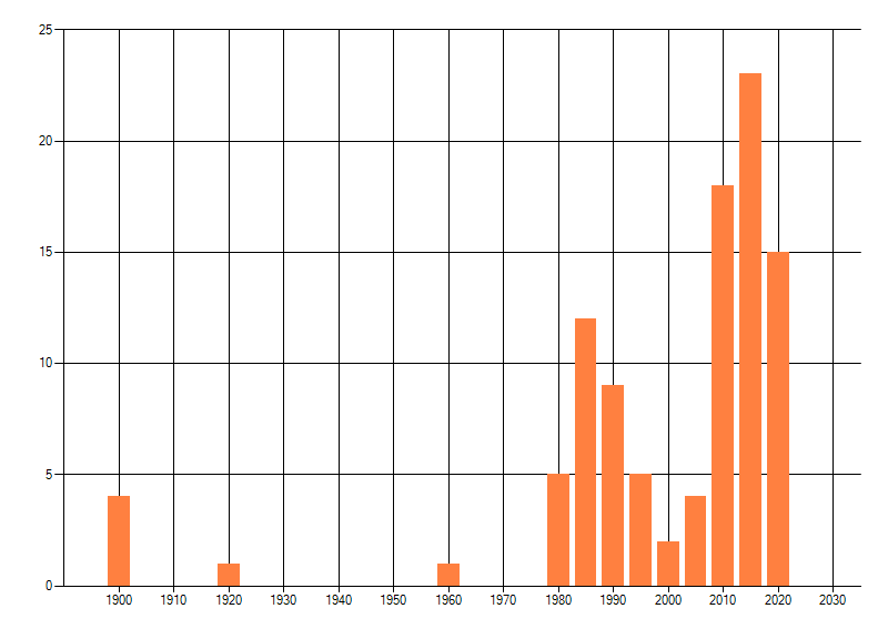 Het aantal atlasblokken (5x5 km) waarin de soort is gemeld binnen een periode van vijf jaar (vanaf 1980) of twintig jaar. Niet gecorrigeerd voor waarnemersinspanning en het aantal doorgegeven waarnemingen kan sterk variëren per periode, dus een trend in verspreiding kan hier niet direct uit worden afgelezen. Het opgegeven jaartal is het eerste jaar van de periode. Bron: gevalideerde waarnemingen uit de NDFF.