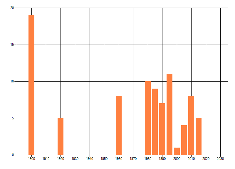 Het aantal atlasblokken (5x5 km) waarin de soort is gemeld binnen een periode van vijf jaar (vanaf 1980) of twintig jaar. Niet gecorrigeerd voor waarnemersinspanning en het aantal doorgegeven waarnemingen kan sterk variëren per periode, dus een trend in verspreiding kan hier niet direct uit worden afgelezen. Het opgegeven jaartal is het eerste jaar van de periode. Bron: gevalideerde waarnemingen uit de NDFF.