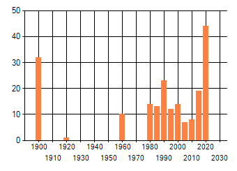 Het aantal atlasblokken (5x5 km) waarin de soort is gemeld binnen een periode van vijf jaar (vanaf 1980) of twintig jaar. Niet gecorrigeerd voor waarnemersinspanning en het aantal doorgegeven waarnemingen kan sterk variëren per periode, dus een trend in verspreiding kan hier niet direct uit worden afgelezen. Het opgegeven jaartal is het eerste jaar van de periode. Bron: gevalideerde waarnemingen uit de NDFF.