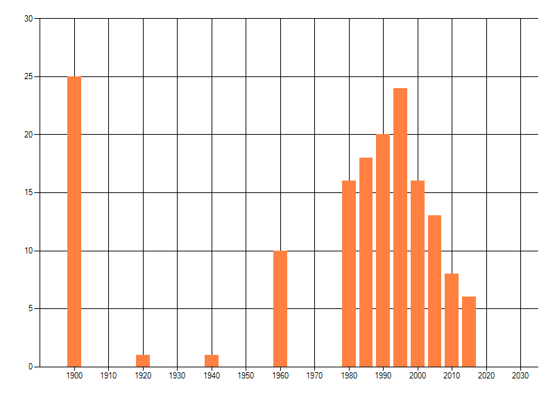 Het aantal atlasblokken (5x5 km) waarin de soort is gemeld binnen een periode van vijf jaar (vanaf 1980) of twintig jaar. Niet gecorrigeerd voor waarnemersinspanning en het aantal doorgegeven waarnemingen kan sterk variëren per periode, dus een trend in verspreiding kan hier niet direct uit worden afgelezen. Het opgegeven jaartal is het eerste jaar van de periode. Bron: gevalideerde waarnemingen uit de NDFF.