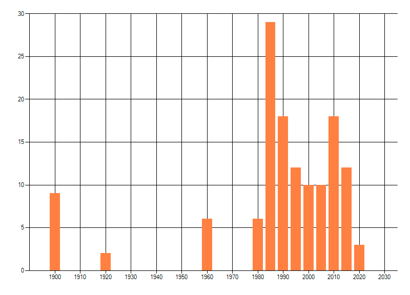 Het aantal atlasblokken (5x5 km) waarin de soort is gemeld binnen een periode van vijf jaar (vanaf 1980) of twintig jaar. Niet gecorrigeerd voor waarnemersinspanning en het aantal doorgegeven waarnemingen kan sterk variëren per periode, dus een trend in verspreiding kan hier niet direct uit worden afgelezen. Het opgegeven jaartal is het eerste jaar van de periode. Bron: gevalideerde waarnemingen uit de NDFF.