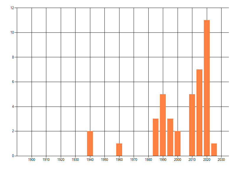 Het aantal atlasblokken (5x5 km) waarin de soort is gemeld binnen een periode van vijf jaar (vanaf 1980) of twintig jaar. Niet gecorrigeerd voor waarnemersinspanning en het aantal doorgegeven waarnemingen kan sterk variëren per periode, dus een trend in verspreiding kan hier niet direct uit worden afgelezen. Het opgegeven jaartal is het eerste jaar van de periode. Bron: gevalideerde waarnemingen uit de NDFF.
