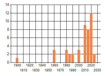 Het aantal atlasblokken (5x5 km) waarin de soort is gemeld binnen een periode van vijf jaar (vanaf 1980) of twintig jaar. Niet gecorrigeerd voor waarnemersinspanning en het aantal doorgegeven waarnemingen kan sterk variëren per periode, dus een trend in verspreiding kan hier niet direct uit worden afgelezen. Het opgegeven jaartal is het eerste jaar van de periode. Bron: gevalideerde waarnemingen uit de NDFF.