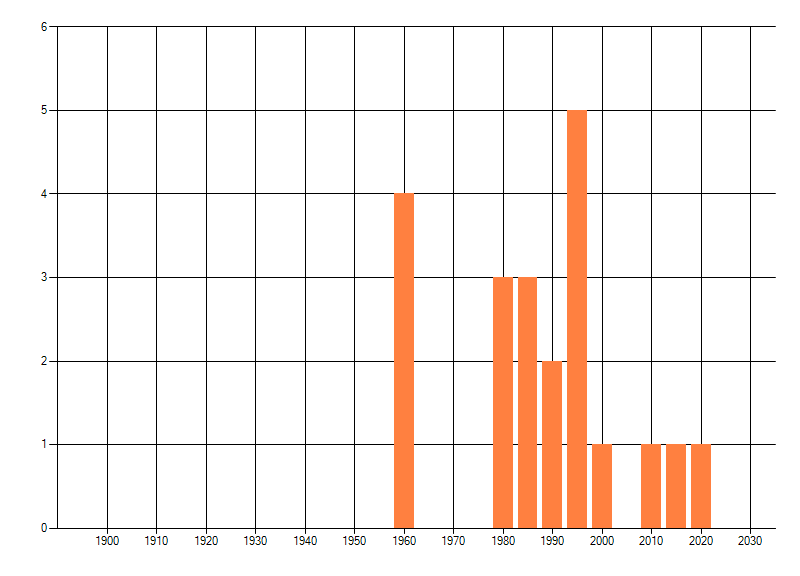 Het aantal atlasblokken (5x5 km) waarin de soort is gemeld binnen een periode van vijf jaar (vanaf 1980) of twintig jaar. Niet gecorrigeerd voor waarnemersinspanning en het aantal doorgegeven waarnemingen kan sterk variëren per periode, dus een trend in verspreiding kan hier niet direct uit worden afgelezen. Het opgegeven jaartal is het eerste jaar van de periode. Bron: gevalideerde waarnemingen uit de NDFF.