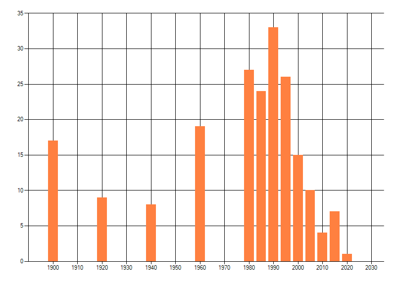 Het aantal atlasblokken (5x5 km) waarin de soort is gemeld binnen een periode van vijf jaar (vanaf 1980) of twintig jaar. Niet gecorrigeerd voor waarnemersinspanning en het aantal doorgegeven waarnemingen kan sterk variëren per periode, dus een trend in verspreiding kan hier niet direct uit worden afgelezen. Het opgegeven jaartal is het eerste jaar van de periode. Bron: gevalideerde waarnemingen uit de NDFF.