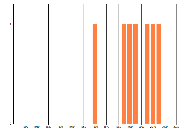 Het aantal atlasblokken (5x5 km) waarin de soort is gemeld binnen een periode van vijf jaar (vanaf 1980) of twintig jaar. Niet gecorrigeerd voor waarnemersinspanning en het aantal doorgegeven waarnemingen kan sterk variëren per periode, dus een trend in verspreiding kan hier niet direct uit worden afgelezen. Het opgegeven jaartal is het eerste jaar van de periode. Bron: gevalideerde waarnemingen uit de NDFF.