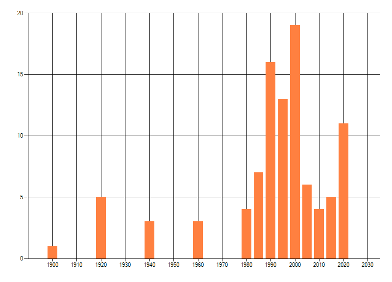 Het aantal atlasblokken (5x5 km) waarin de soort is gemeld binnen een periode van vijf jaar (vanaf 1980) of twintig jaar. Niet gecorrigeerd voor waarnemersinspanning en het aantal doorgegeven waarnemingen kan sterk variëren per periode, dus een trend in verspreiding kan hier niet direct uit worden afgelezen. Het opgegeven jaartal is het eerste jaar van de periode. Bron: gevalideerde waarnemingen uit de NDFF.