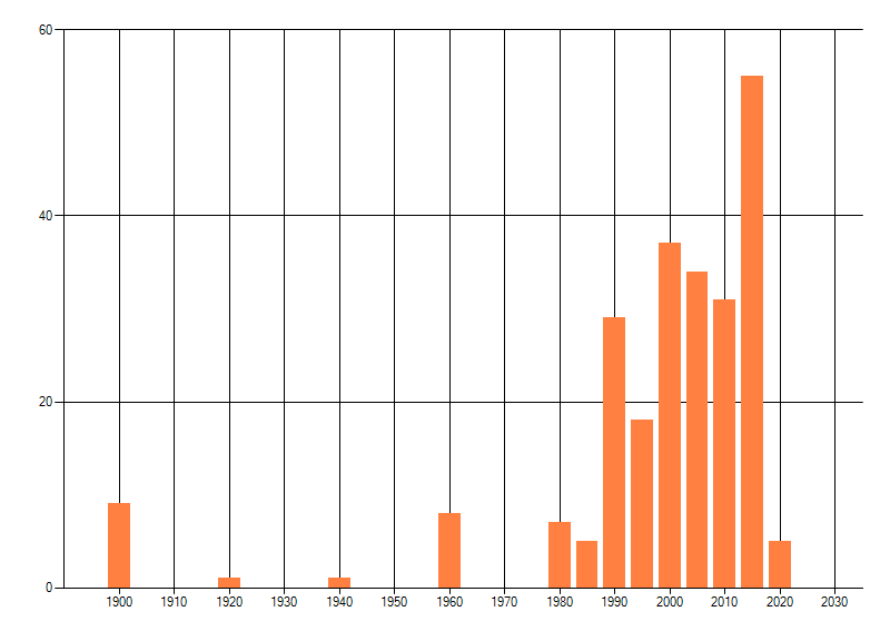 Het aantal atlasblokken (5x5 km) waarin de soort is gemeld binnen een periode van vijf jaar (vanaf 1980) of twintig jaar. Niet gecorrigeerd voor waarnemersinspanning en het aantal doorgegeven waarnemingen kan sterk variëren per periode, dus een trend in verspreiding kan hier niet direct uit worden afgelezen. Het opgegeven jaartal is het eerste jaar van de periode. Bron: gevalideerde waarnemingen uit de NDFF.