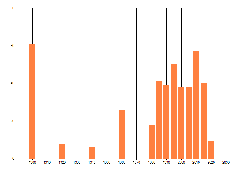 Het aantal atlasblokken (5x5 km) waarin de soort is gemeld binnen een periode van vijf jaar (vanaf 1980) of twintig jaar. Niet gecorrigeerd voor waarnemersinspanning en het aantal doorgegeven waarnemingen kan sterk variëren per periode, dus een trend in verspreiding kan hier niet direct uit worden afgelezen. Het opgegeven jaartal is het eerste jaar van de periode. Bron: gevalideerde waarnemingen uit de NDFF.