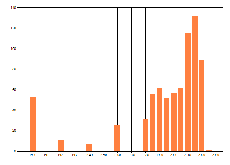 Het aantal atlasblokken (5x5 km) waarin de soort is gemeld binnen een periode van vijf jaar (vanaf 1980) of twintig jaar. Niet gecorrigeerd voor waarnemersinspanning en het aantal doorgegeven waarnemingen kan sterk variëren per periode, dus een trend in verspreiding kan hier niet direct uit worden afgelezen. Het opgegeven jaartal is het eerste jaar van de periode. Bron: gevalideerde waarnemingen uit de NDFF.
