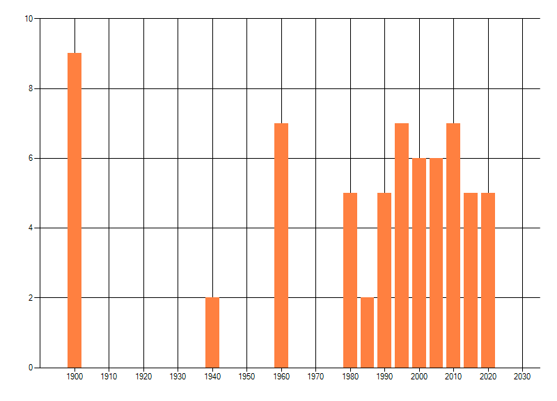 Het aantal atlasblokken (5x5 km) waarin de soort is gemeld binnen een periode van vijf jaar (vanaf 1980) of twintig jaar. Niet gecorrigeerd voor waarnemersinspanning en het aantal doorgegeven waarnemingen kan sterk variëren per periode, dus een trend in verspreiding kan hier niet direct uit worden afgelezen. Het opgegeven jaartal is het eerste jaar van de periode. Bron: gevalideerde waarnemingen uit de NDFF.