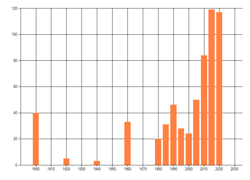 Het aantal atlasblokken (5x5 km) waarin de soort is gemeld binnen een periode van vijf jaar (vanaf 1980) of twintig jaar. Niet gecorrigeerd voor waarnemersinspanning en het aantal doorgegeven waarnemingen kan sterk variëren per periode, dus een trend in verspreiding kan hier niet direct uit worden afgelezen. Het opgegeven jaartal is het eerste jaar van de periode. Bron: gevalideerde waarnemingen uit de NDFF.