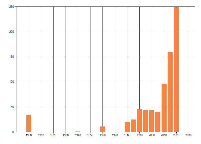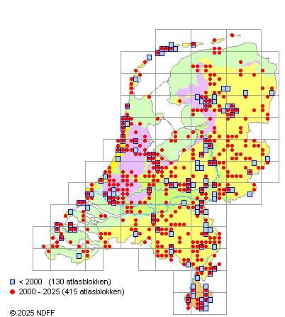 Het aantal atlasblokken (5x5 km) waarin de soort is gemeld binnen een periode van vijf jaar (vanaf 1980) of twintig jaar. Niet gecorrigeerd voor waarnemersinspanning en het aantal doorgegeven waarnemingen kan sterk variëren per periode, dus een trend in verspreiding kan hier niet direct uit worden afgelezen. Het opgegeven jaartal is het eerste jaar van de periode. Bron: gevalideerde waarnemingen uit de NDFF.