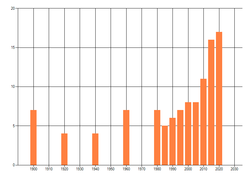 Het aantal atlasblokken (5x5 km) waarin de soort is gemeld binnen een periode van vijf jaar (vanaf 1980) of twintig jaar. Niet gecorrigeerd voor waarnemersinspanning en het aantal doorgegeven waarnemingen kan sterk variëren per periode, dus een trend in verspreiding kan hier niet direct uit worden afgelezen. Het opgegeven jaartal is het eerste jaar van de periode. Bron: gevalideerde waarnemingen uit de NDFF.