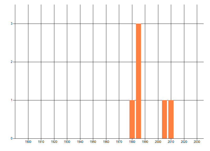 Het aantal atlasblokken (5x5 km) waarin de soort is gemeld binnen een periode van vijf jaar (vanaf 1980) of twintig jaar. Niet gecorrigeerd voor waarnemersinspanning en het aantal doorgegeven waarnemingen kan sterk variëren per periode, dus een trend in verspreiding kan hier niet direct uit worden afgelezen. Het opgegeven jaartal is het eerste jaar van de periode. Bron: gevalideerde waarnemingen uit de NDFF.