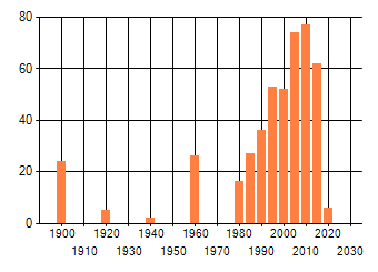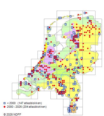 Het aantal atlasblokken (5x5 km) waarin de soort is gemeld binnen een periode van vijf jaar (vanaf 1980) of twintig jaar. Niet gecorrigeerd voor waarnemersinspanning en het aantal doorgegeven waarnemingen kan sterk variëren per periode, dus een trend in verspreiding kan hier niet direct uit worden afgelezen. Het opgegeven jaartal is het eerste jaar van de periode. Bron: gevalideerde waarnemingen uit de NDFF.