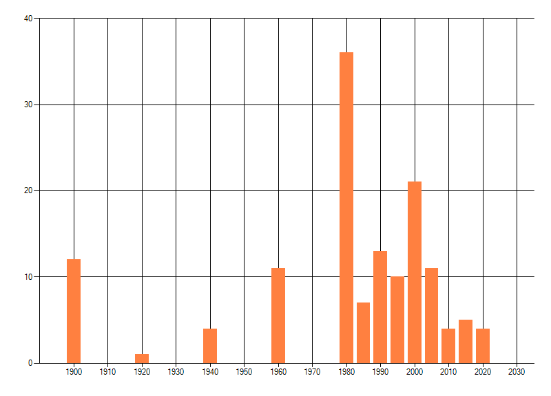 Het aantal atlasblokken (5x5 km) waarin de soort is gemeld binnen een periode van vijf jaar (vanaf 1980) of twintig jaar. Niet gecorrigeerd voor waarnemersinspanning en het aantal doorgegeven waarnemingen kan sterk variëren per periode, dus een trend in verspreiding kan hier niet direct uit worden afgelezen. Het opgegeven jaartal is het eerste jaar van de periode. Bron: gevalideerde waarnemingen uit de NDFF.