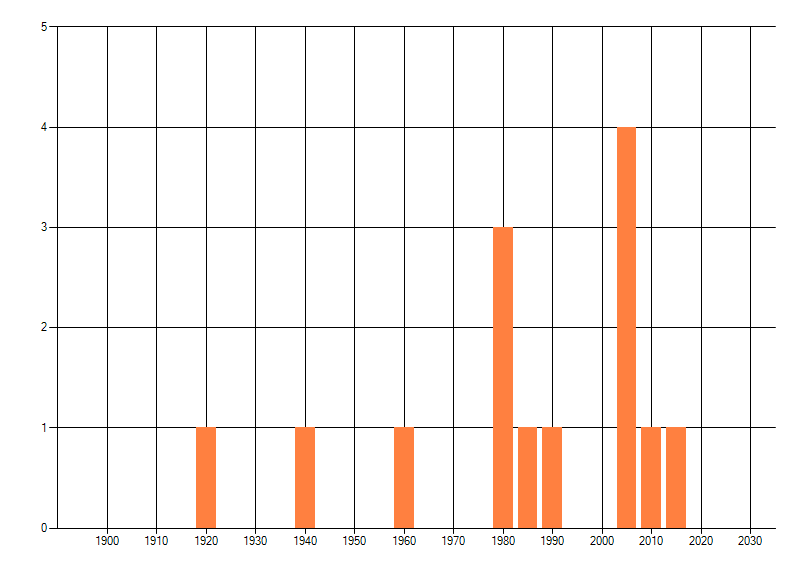 Het aantal atlasblokken (5x5 km) waarin de soort is gemeld binnen een periode van vijf jaar (vanaf 1980) of twintig jaar. Niet gecorrigeerd voor waarnemersinspanning en het aantal doorgegeven waarnemingen kan sterk variëren per periode, dus een trend in verspreiding kan hier niet direct uit worden afgelezen. Het opgegeven jaartal is het eerste jaar van de periode. Bron: gevalideerde waarnemingen uit de NDFF.