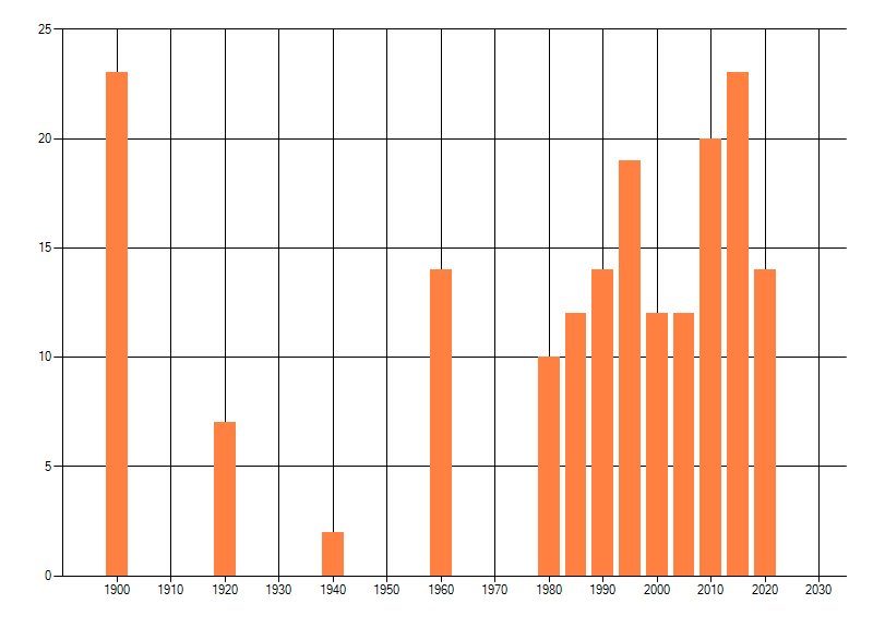 Het aantal atlasblokken (5x5 km) waarin de soort is gemeld binnen een periode van vijf jaar (vanaf 1980) of twintig jaar. Niet gecorrigeerd voor waarnemersinspanning en het aantal doorgegeven waarnemingen kan sterk variëren per periode, dus een trend in verspreiding kan hier niet direct uit worden afgelezen. Het opgegeven jaartal is het eerste jaar van de periode. Bron: gevalideerde waarnemingen uit de NDFF.