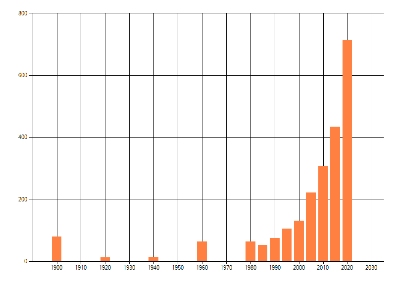 Het aantal atlasblokken (5x5 km) waarin de soort is gemeld binnen een periode van vijf jaar (vanaf 1980) of twintig jaar. Niet gecorrigeerd voor waarnemersinspanning en het aantal doorgegeven waarnemingen kan sterk variëren per periode, dus een trend in verspreiding kan hier niet direct uit worden afgelezen. Het opgegeven jaartal is het eerste jaar van de periode. Bron: gevalideerde waarnemingen uit de NDFF.