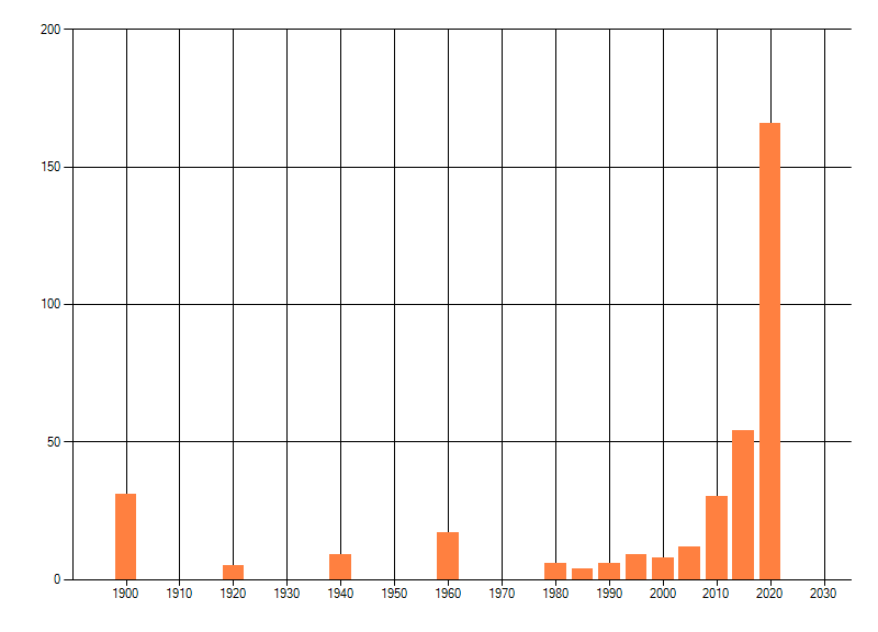 Het aantal atlasblokken (5x5 km) waarin de soort is gemeld binnen een periode van vijf jaar (vanaf 1980) of twintig jaar. Niet gecorrigeerd voor waarnemersinspanning en het aantal doorgegeven waarnemingen kan sterk variëren per periode, dus een trend in verspreiding kan hier niet direct uit worden afgelezen. Het opgegeven jaartal is het eerste jaar van de periode. Bron: gevalideerde waarnemingen uit de NDFF.